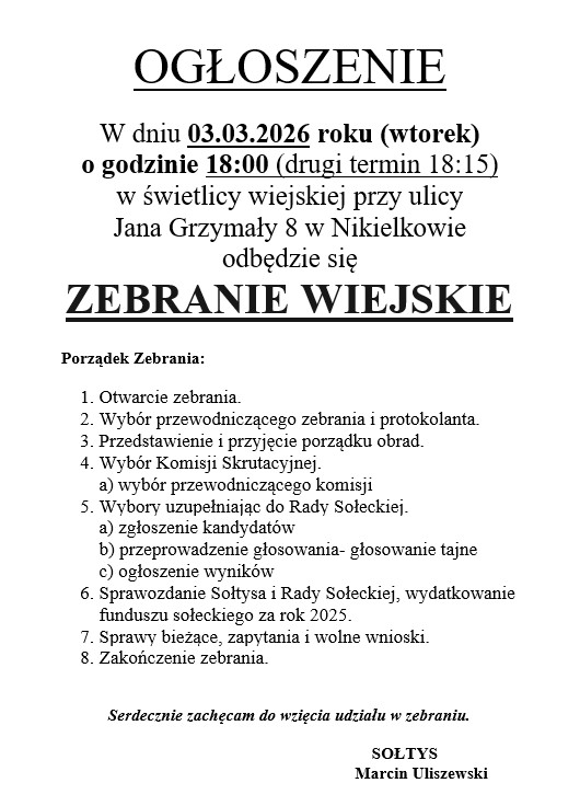 Zapraszam mieszkańców Sołectwa Nikielkowo na Zebranie Wiejskie 3 marca 2026r. na godzinę 18:00 w świetlicy wiejskiej w Nikielkowie ul. Jana Grzymały 8.